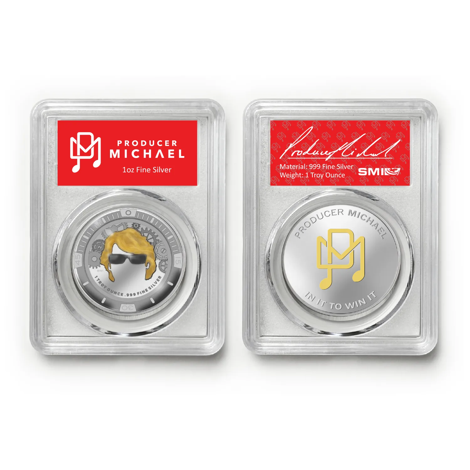 Die Rückseite zeigt das Logo von Marc Gebauer in Kombination mit feinen geometrischen Linien, eingefasst von einer umlaufenden Gravur mit den Werten: „ONE TROY OUNCE – 999 FINE SILVER – PRODUCER MICHAEL – IN IT TO WIN IT“. Die klassische Reliefprägung hebt sich präzise vom Hintergrund ab und erzeugt ein hochwertiges, taktiles Erlebnis – ganz ohne Farbe.