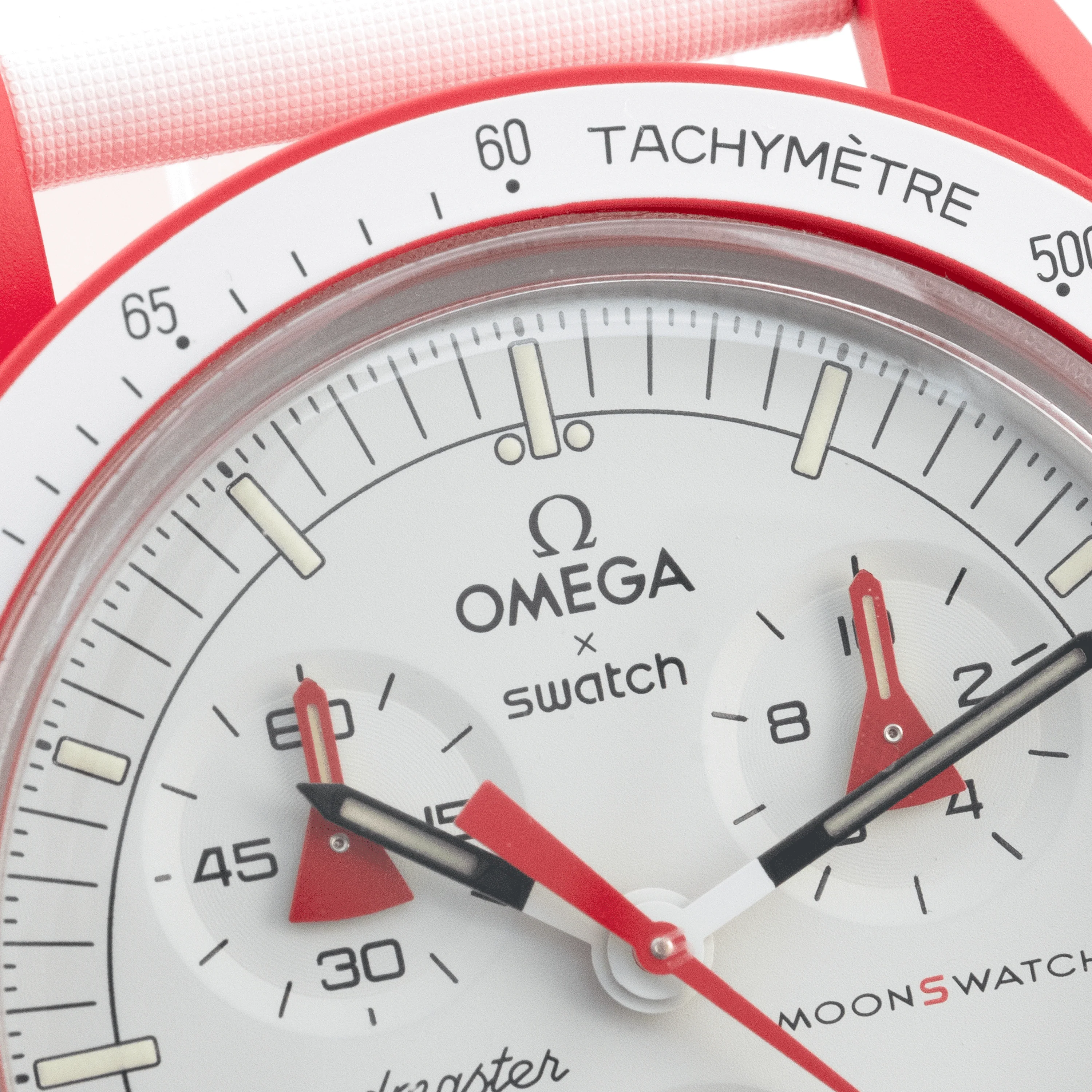 Alle ProdukteBei dieser Hommage an den Mars kontrastieren feurige Rottöne mit dem strahlend weißen Zifferblatt und dem VELCRO©-Armband. Der Sekundenzeiger des Chronographen ist in Rot gehalten, während sowohl die Stunden- als auch die Minuten-Totalisatoren mit markanten roten Zeigern in Form eines Raumschiff gestaltet sind. Die Zifferblätter sind mit dem OMEGA X SWATCH Branding, sowie dem legendären Speedmaster Logo und dem neuen MoonSwatch Logo versehen. Alle Modelle bieten folgende Features, die für eine ausgeprägte Liebe zum Detail stehen: die Glaskonstruktion mit dem kaum sichtbaren „S“ in der Mitte des Glaskörpers, das edle und raffinierte, kreisförmige Muster auf dem äußeren Ring des Zifferblatts und den Totalisatoren, die kantig-fließende Konstruktion der Bandanstöße, den legendären „Punkt über der Neunzig“ auf der Tachymeterskala der Lünette und natürlich die einzigartige Bioceramic-Optik und -Haptik. Sämtliche Stunden-, Minuten- und Sekundenzeiger des Chronographen sowie die Stundenmarkierungen sind mit Superluminova versehen und leuchten perfekt im Dunkeln.